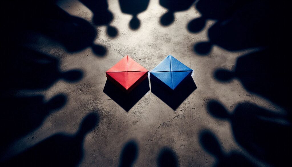 - 赤と青のメンコが象徴する参加者の残酷な運命論と選択の自由