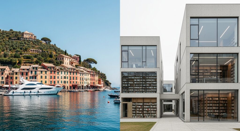 本作の大きな魅力の一つが、イタリアでの海外ロケです。特に第1話の冒頭、コ・ユンジョン演じるトップスター、チャ・ムヒが映画祭のために滞在しているシーンは、イタリア北部の高級リゾート地ポルトフィーノ(Portofino)で撮影されました。2025年6月頃、キム・ソンホとコ・ユンジョンがイタリアで撮影を行っている姿がSNSで話題となっていましたが、配信によってその全貌が明らかになりました。