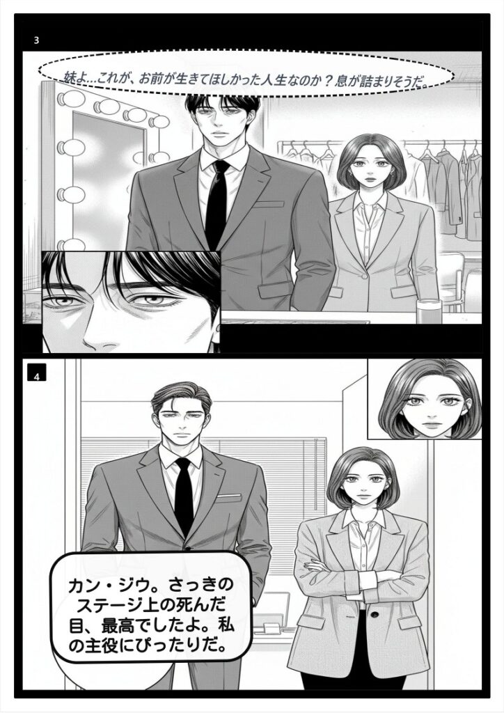 しかし、ソヨンは彼の冷徹な態度にも怯まず、彼の内面に秘められた芸術家としての魂を見抜き、彼が本当に求めている「何か」を言葉ではなく、その揺るぎない眼差しで訴えかけます。彼女は、カン・ジウが抱える「消費される俳優」というレッテルを打ち破り、真の演技で観客を魅了できると信じて疑いません。