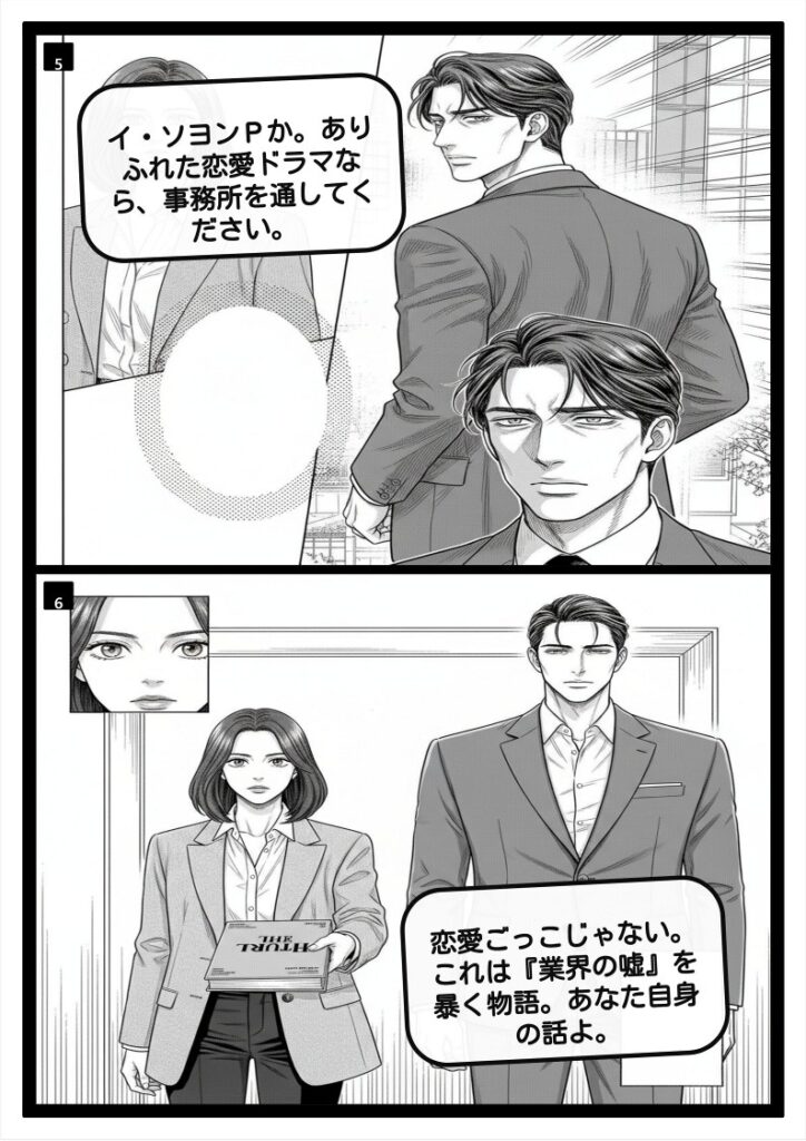 ソヨンもまた、ジウの演技を通じて、自身のメッセージが多くの人々に届いたこと、そして彼の存在が自身の人生にどれほど大きな影響を与えたかを語ります。彼らの間には、言葉では表現できないほどの深い絆が築かれていました。そして、物語のラストシーンでは、二人が新たなプロジェクトについて語り合う姿が描かれます。それは、単なる次の仕事の打ち合わせではなく、これからも共に「真実の物語」を追求していくという、彼らの未来に向けた誓いを象徴するものです。