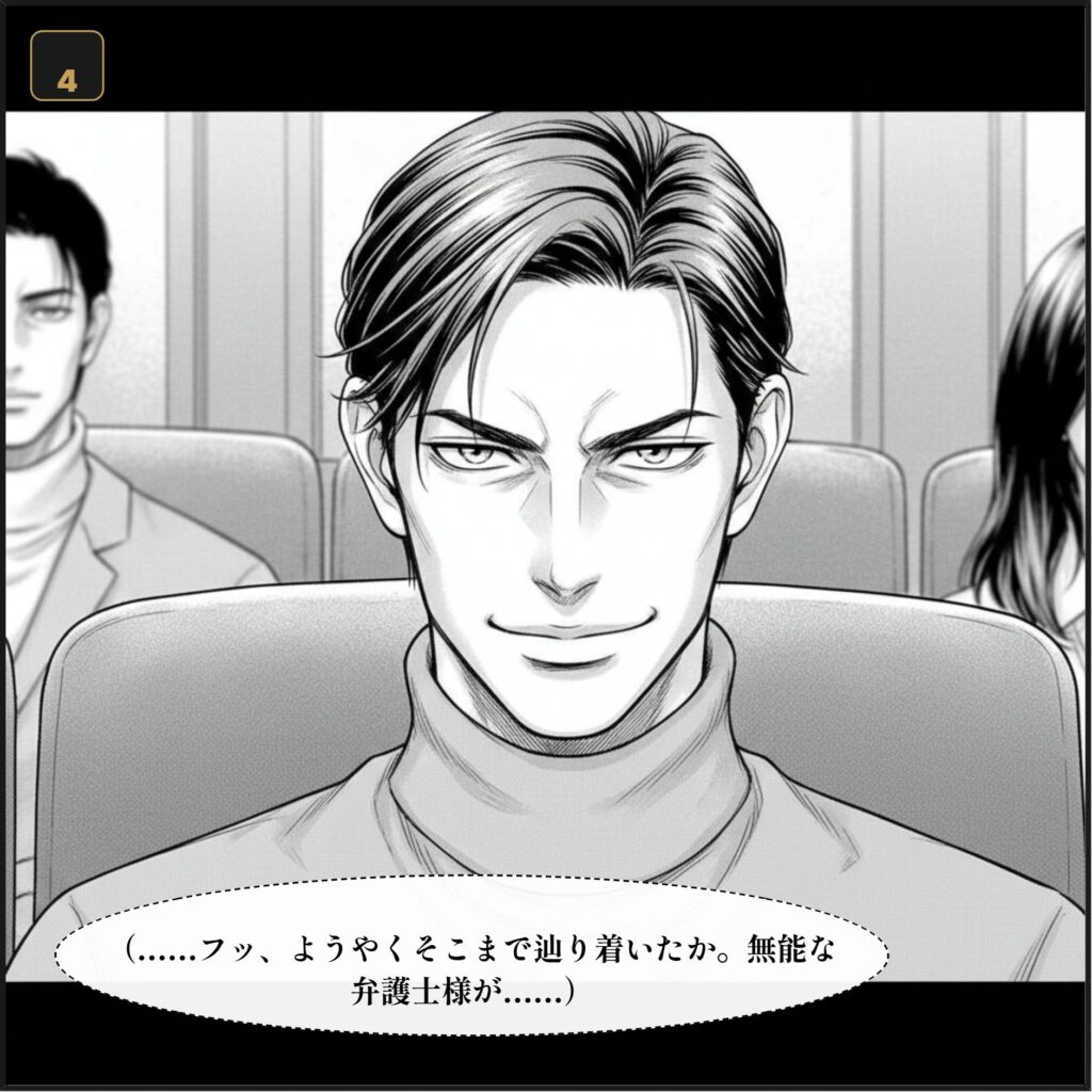 法廷漫画において、冷汗を描かずに「微かな微笑」を描く場合、そのキャラクターはラスボス級の秘密を抱えていることが多いです。