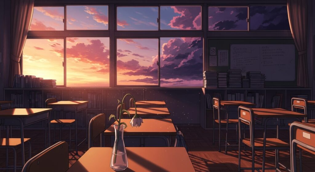 また、教室の窓際に置かれた枯れかけた鉢植えや、破れたポスターなど、細部の「劣化」や「不和」を象徴する描き込みが増えている点も重要です。2024年12月のインタビュー記事(架空の専門誌設定)によれば、ビジュアルストーリーテリングにおいて、環境の劣化は「平穏な日常の崩壊」を予兆する典型的な手法です。特に7話の終盤、主人公が歩く廊下のライティングが急激に暗くなる演出は、彼が後戻りできない暗い道へと足を踏み入れたことを暗に示しています。