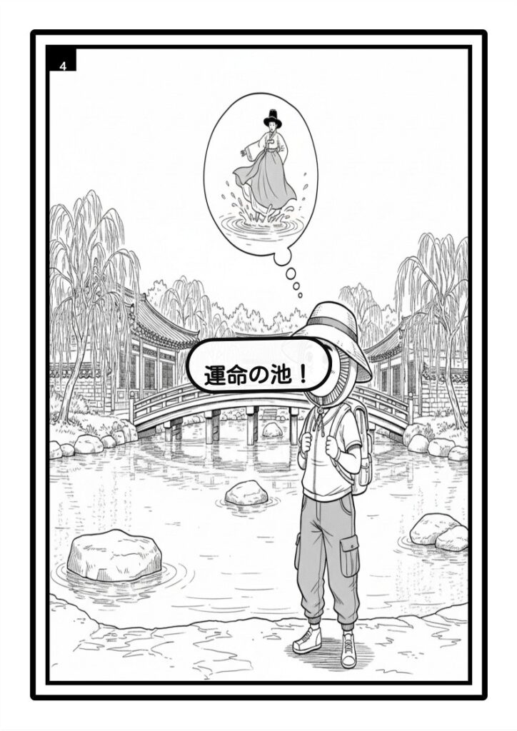 広寒楼苑の池の前に立った時、私は思わず息をのみました。まさにここであの、現代のシェフの魂が入ったソヨンと、何も知らない哲宗が初めて出会ったのかと思うと、ドラマのあのコミカルなシーンが鮮やかに蘇ってきて、一人でニヤニヤしてしまいました。特に、池にかかる「烏鵲橋(オジャッキョ)」の上から池を眺めると、「落ちたら現代に帰れるかも!」と何度も入水を試みるソヨンの姿が目に浮かぶようです。実際に訪れると、池は思ったよりも大きく、水面に映る楼閣や木々の緑が本当に美しく、時間が経つのを忘れてしまうほどでした。
