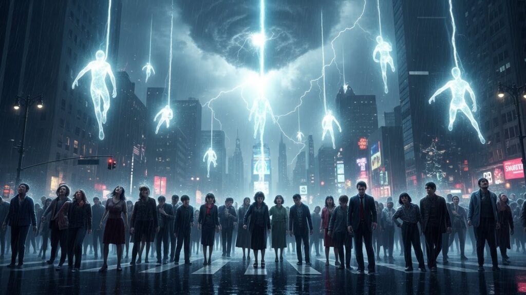 空を覆い尽くさんばかりに出現する天使のような幻影と、無差別に死を告げられる市民たち。この現象は、もはや「個人の罪」への罰ではなく、人類全体に対する「リセット」や「単なる災害」のような様相を呈し始めます。この変化により、これまでの宗教的な意味付けは全て無意味となり、人々は純粋な絶望に突き落とされます。