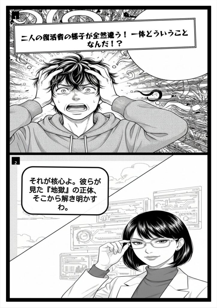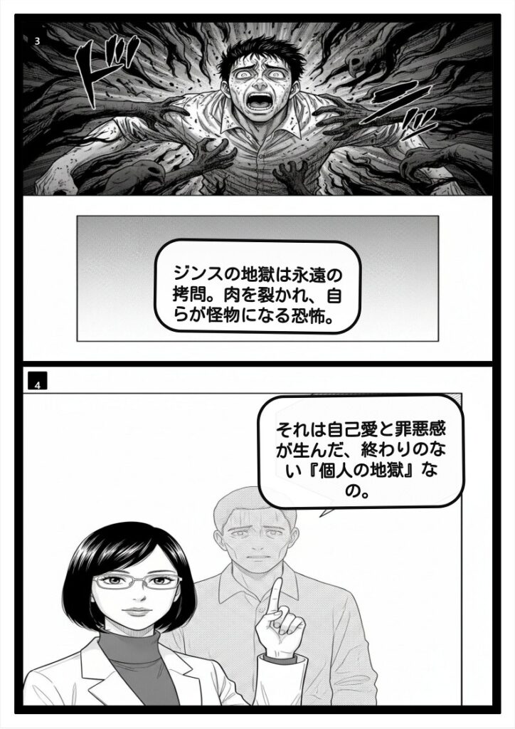 チョン・ジンスとパク・ジョンジャ、二人の復活者が語る地獄の内容は対照的です。チョン・ジンスにとって地獄は、自分の肉体が引き裂かれ、意識だけが永遠に苦痛を味わい続ける絶望の場所でした。彼はそこで「自分自身が怪物になる」という幻覚を見せられ続け、現世に戻った後もその侵食に怯えていました。彼の語る地獄は、自己愛と恐怖が混ざり合った「個人の地獄」です。