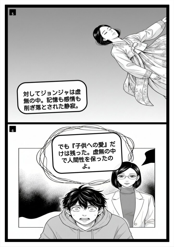 対して、パク・ジョンジャが見た地獄は、感情や記憶が欠落した虚無のような世界でした。彼女はその深淵を覗き見たことで、現世における全ての執着が意味をなさないことを悟ります。しかし、彼女が子供への愛だけを唯一の拠り所としたことは、地獄という絶対的な否定の中に唯一残る「人間性の残り香」を感じさせます。