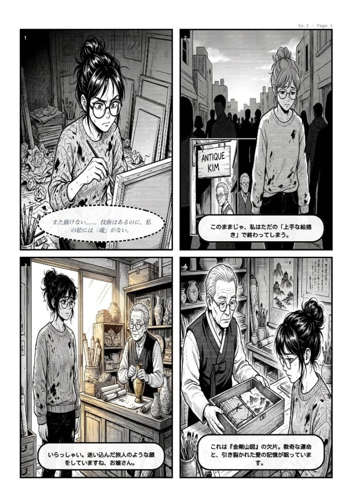 物語の扉を開くのは、現代のソウル。韓国大学で美術史の非常勤講師として働く主人公ソ・ジユン(イ・ヨンエ)は、長年の夢であった教授就任を目前にしていました。彼女は指導教授であるミン・ジョンハクが発見したという古画「金剛山図」の発表を任されますが、その絵に違和感を覚え、正直に意見したことで教授の怒りを買い、学界から追放される危機に立たされます。さらに、投資会社を経営する夫ミンソクは突然の失踪。まさに八方塞がりの状況で、彼女は学会のために訪れたイタリア・ボローニャで、運命に導かれるように一冊の古い漢文の日記を手に入れるのです。